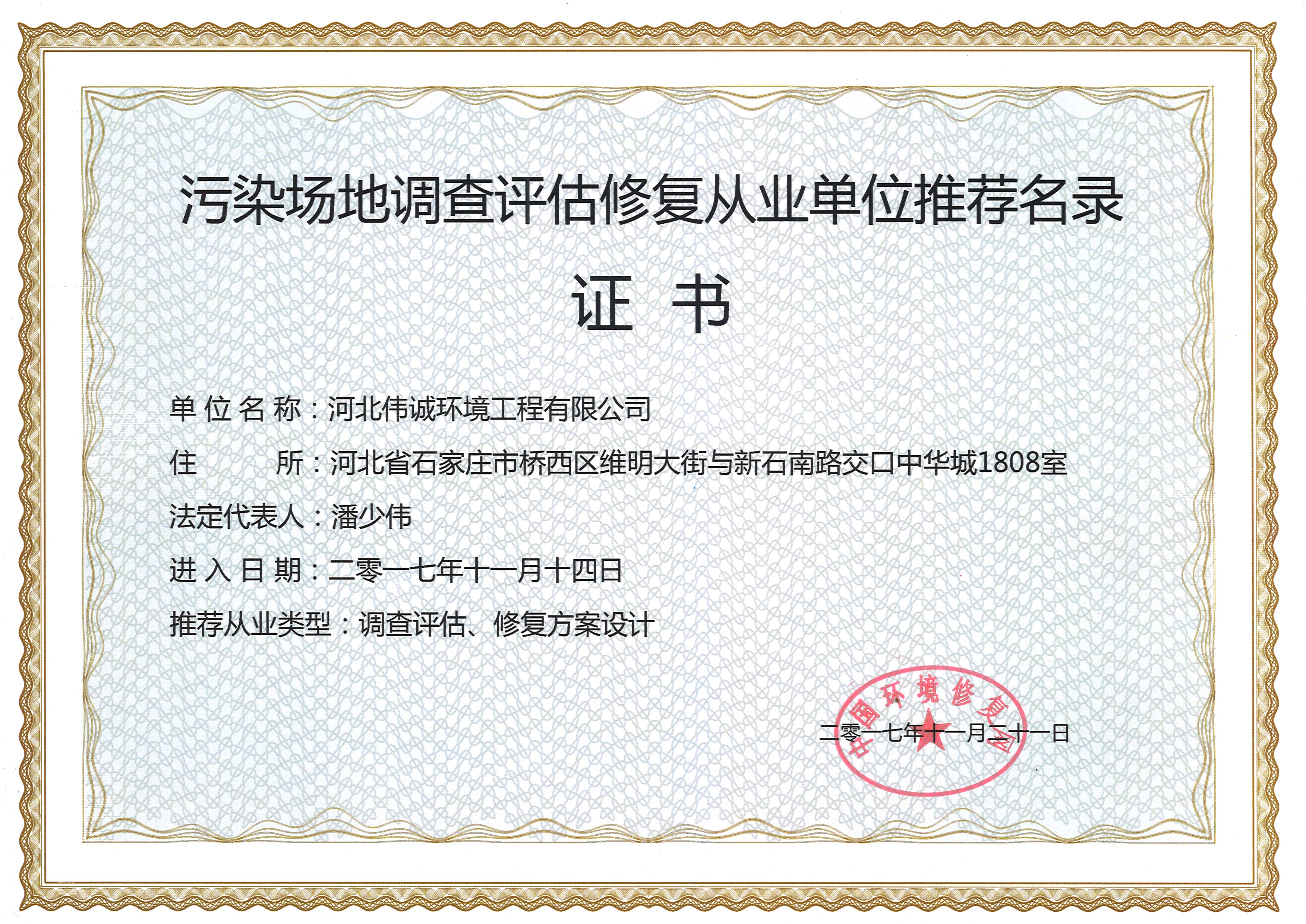 污染场地调查评估修复从业单位推荐名录证书 |