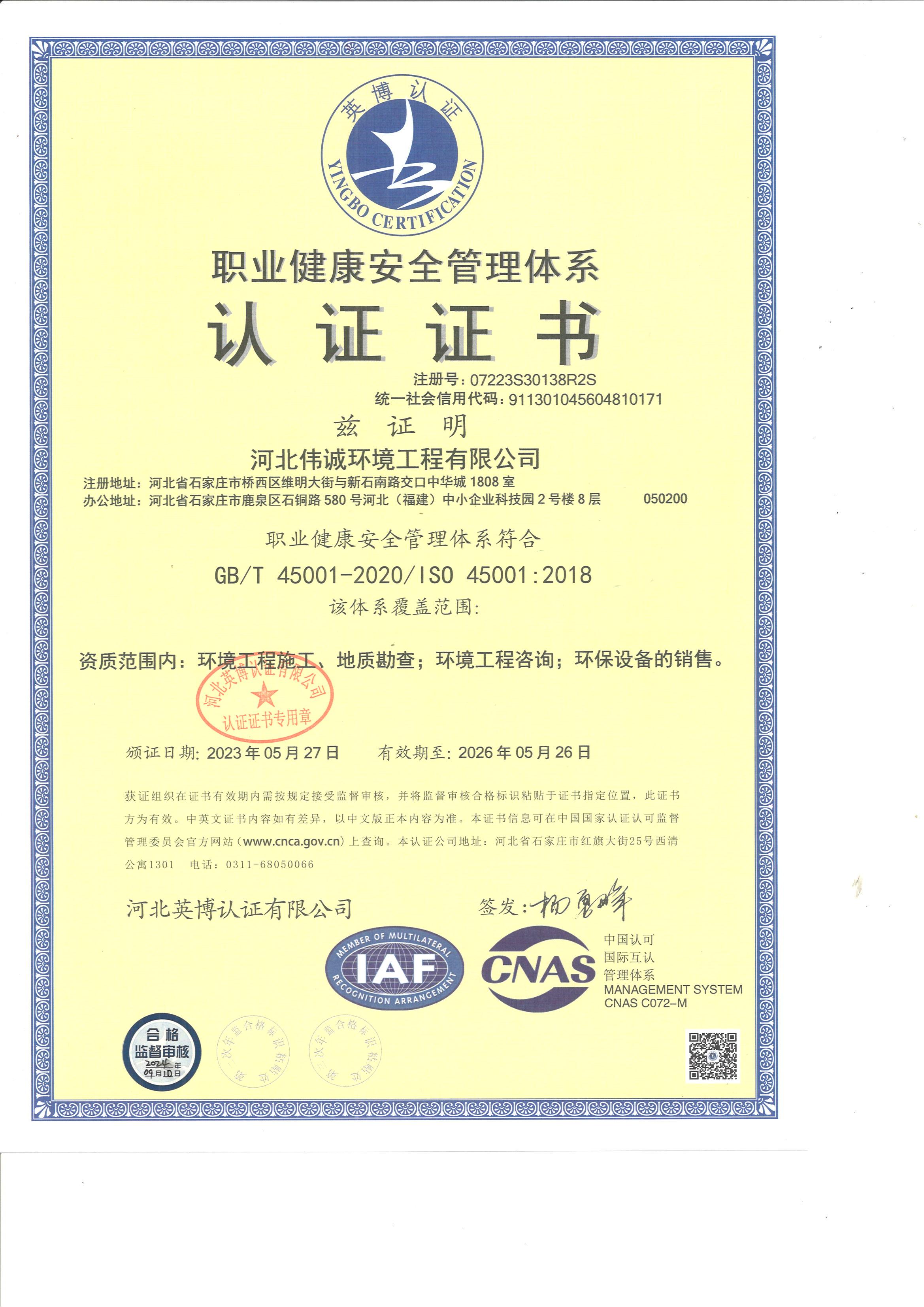 职业健康安全管理体系认证证书 |