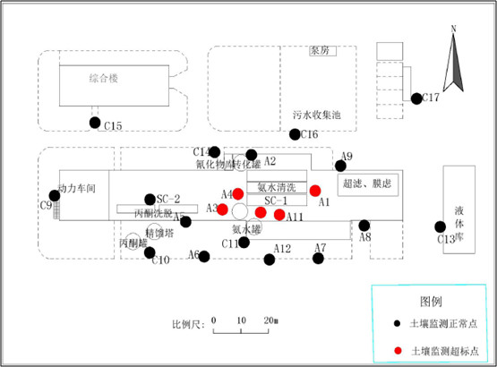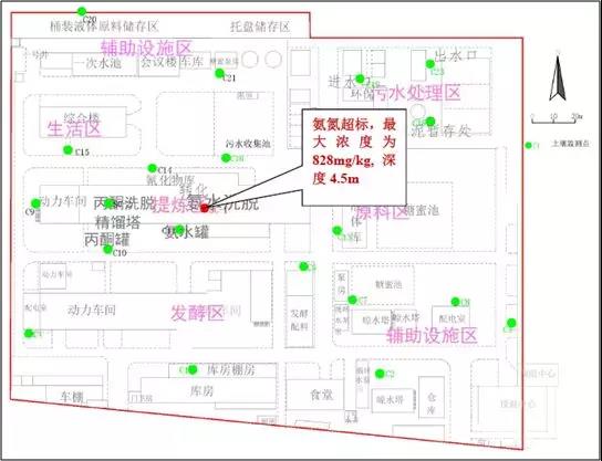 初步调查阶段结论氨氮超出了筛选值,需在详细调查阶段将对已经明确的污染区域进行加密采样,对初步调查*大污染深度的点位进行加深采样。一般来说,详细调查阶段主要是针对涉嫌污染区域,土壤采样点数每400平方米不少于一个,地下水的采样密度一般要求是每6400平方米不少于一个。根据采样调查结果,该制药厂场地土壤仅有氨检出浓度超过筛选值,下图为该地块土壤氨氮超出筛选值的点位图。